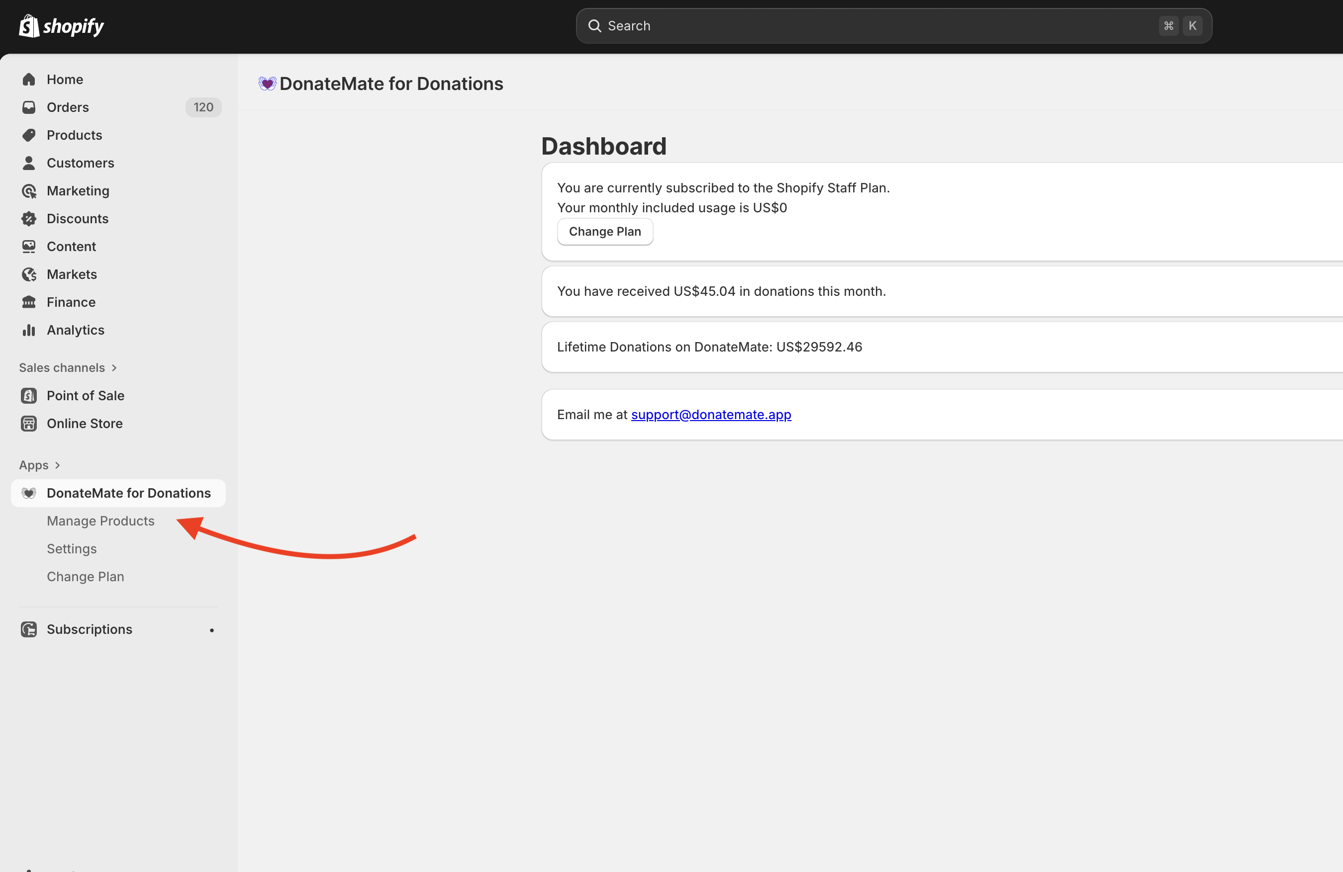To set up your preset donation values, start by going to Shopify Admin > Apps > DonateMate for Donations > Manage Products.